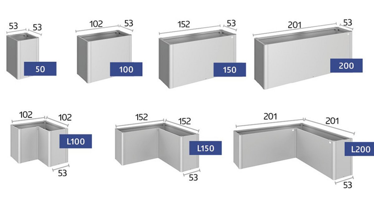Available in sizes 50, 100, 150, 200, L100, L150 and L200 and heights MINI (45 cm), MIDI (61 cm) and MAXI (77 cm)