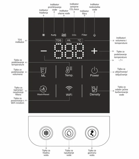 Wash (ispiranje sustava): držite tipku 3 sekunde. Sustav počinje automatsko ispiranje. Za ispuštanje vode tijekom pranja pritisnite zajedno Ice water i Water outlet tipke.