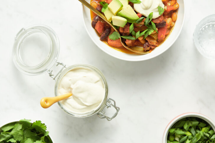 Bogata, kremasta i lagano kiselkasta veganska verzija kiselog vrhnja – potpuno biljna i savršena uz chili, tacose, burritose, pečeno povrće ili kao umak.