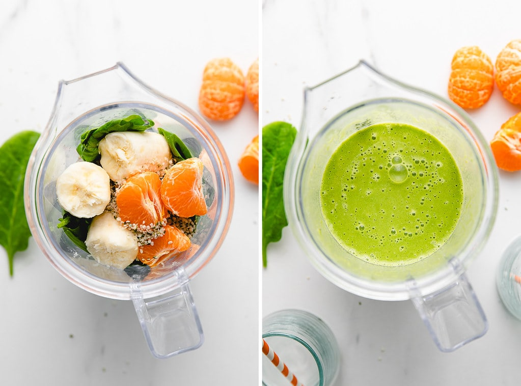 Oguljenu bananu, mandarine, špinat, konopljin protein, vodu i led stavi u blender i blendaj dok smjesa ne postane potpuno glatka i kremasta, otprilike 1 minutu.