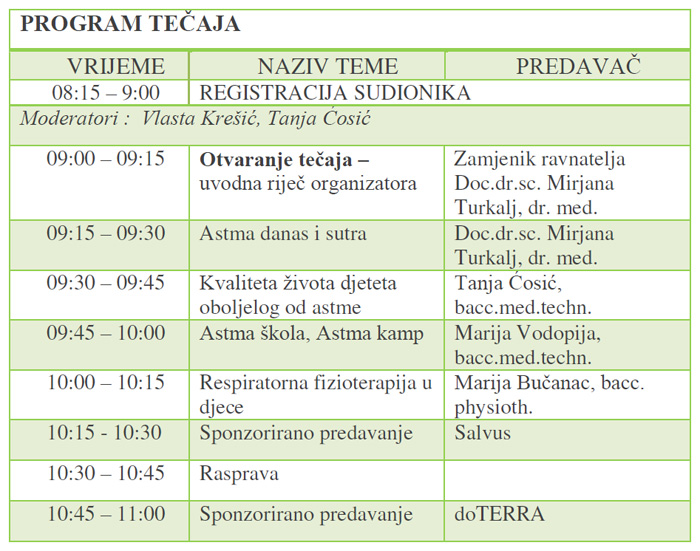 Kroz predavanja i edukativnih radionicama cilj tečaja je unaprijediti znanje polaznika o liječenju, prevenciji i kontroli bolesti, važnosti sporta i zdrave prehrane, te podržavanje djece u aktivnostima koje ih ispunjavaju i čine zdravijima i sretnijima. Izborom stručnih tema predavanja također ćemo Vas upoznati sa bogatim stručnim aktivnostima Dječje bolnice Srebrnjak koja uz liječenje, sustavno provodi i mjere prevencije od astme.